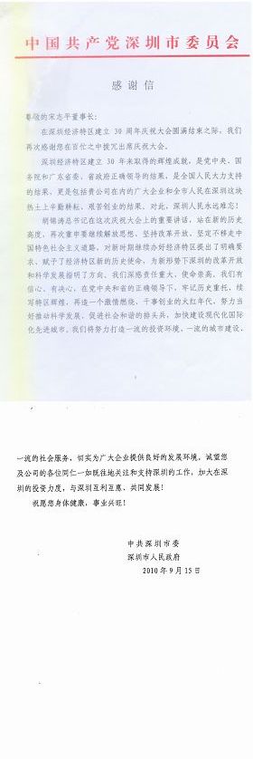"db彩票ios版" 中国共产党深圳市委员会发给集团公司的感谢信