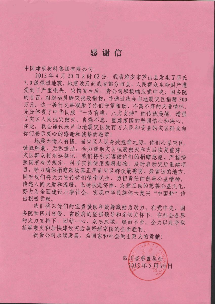 "db彩票正版下载" 四川省慈善总会致中国建材集团的感谢信