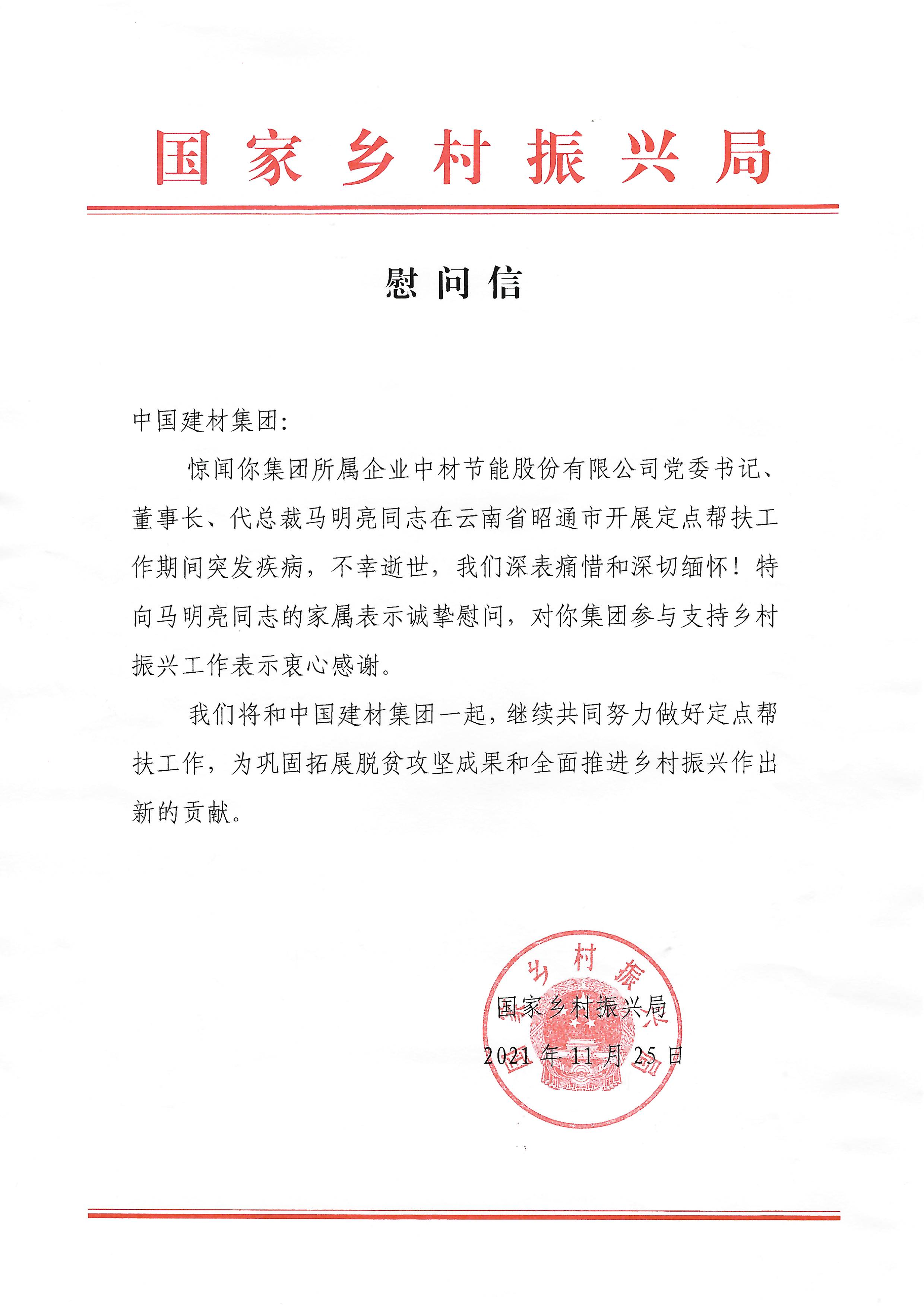 国家乡村振兴局就逝世在帮扶一线马明亮同志致中国建材集团慰问信