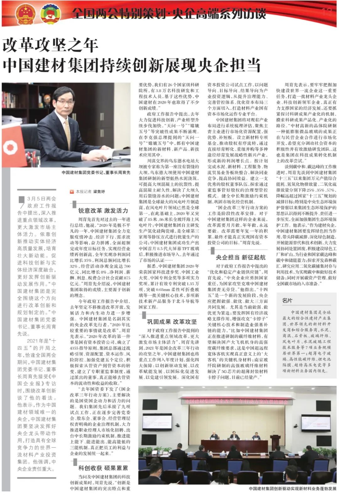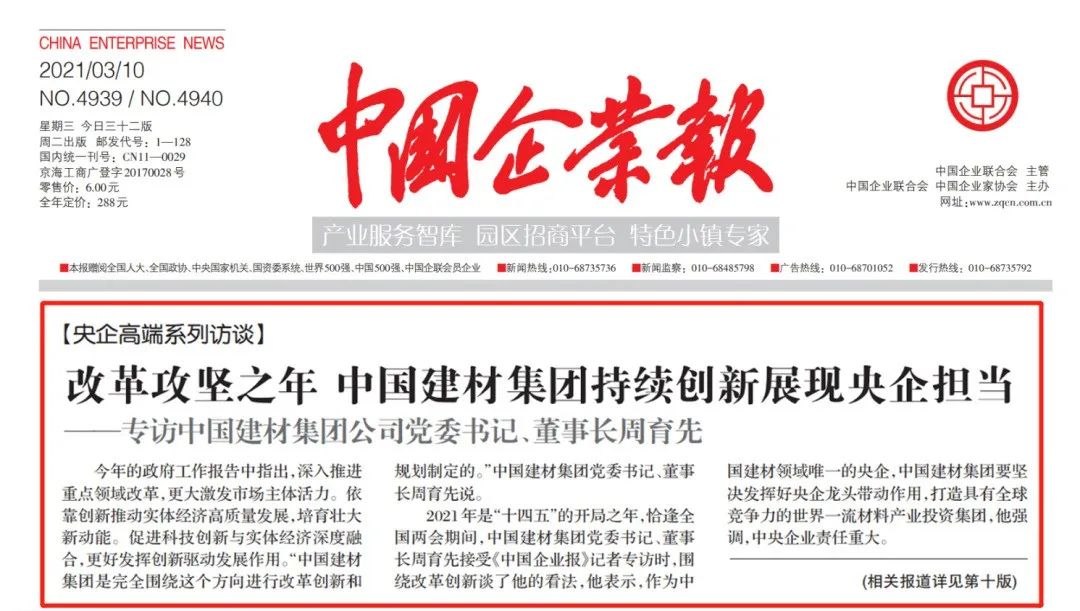 2021年是“十四五”的开局之年 db彩票官方,恰逢全国两会期间,中国建材集团作为中国建材领域唯一的央企,如何发挥好央企龙头带动作用尤为关键,近日围绕改革创新和如何打造具有全球竞争力的世界一流材料产业投资集团等问题,中国建材集团党委书记,董事长周育先接受了中国企业报记者的专访,相关报道在今天报纸的头版进行了刊发。