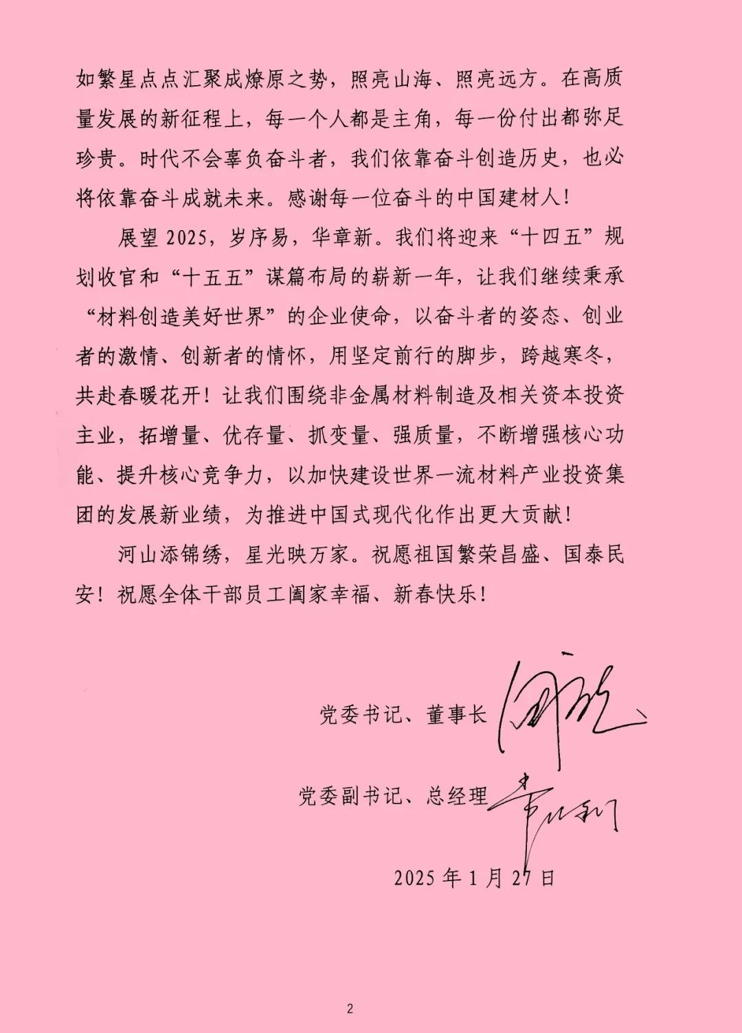 展望2025,岁序易,华章新 db彩票手机版,我们将迎来“十四五”规划收官和“十五五”谋篇布局的崭新一年,让我们继续秉承“材料创造美好世界”的企业使命,以奋斗者的姿态,创业者的激情,创新者的情怀,用坚定前行的脚步,跨越寒冬,共赴春暖花开,让我们围绕非金属材料制造及相关资本投资主业,拓增量,优存量,抓变量,强质量,不断增强核心功能,提升核心竞争力,以加快建设世界一流材料产业投资集团的发展新业绩,为推进中国式现代化作出更大贡献。