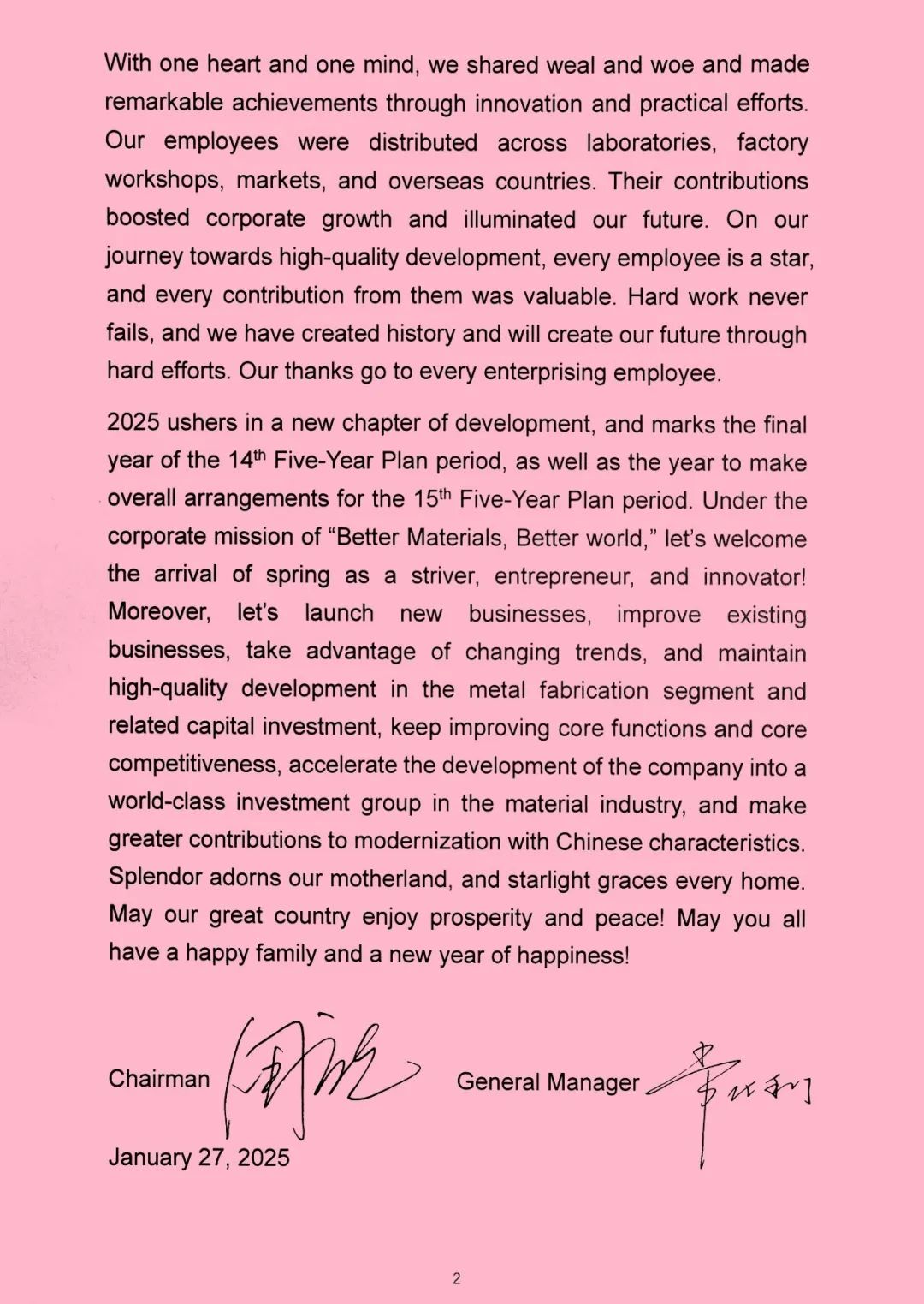 2025 ushers in a new chapter of development, and marks the final year of the 14th Five-Year Plan period, as well as the year to make overall arrangements for the 15th Five-Year Plan period. Under the corporate mission of “Better Materials, Better world”, let’s welcome the arrival of spring as a striver, entrepreneur, and innovator db彩票官网入口. Moreover, let’s launch new businesses, improve existing businesses, take advantage of changing trends, and maintain high-quality development in the metal fabrication segment and related capital investment, keep improving core functions and core competitiveness, accelerate the development of the company into a world-class investment group in the material industry, and make greater contributions to modernization with Chinese characteristics.