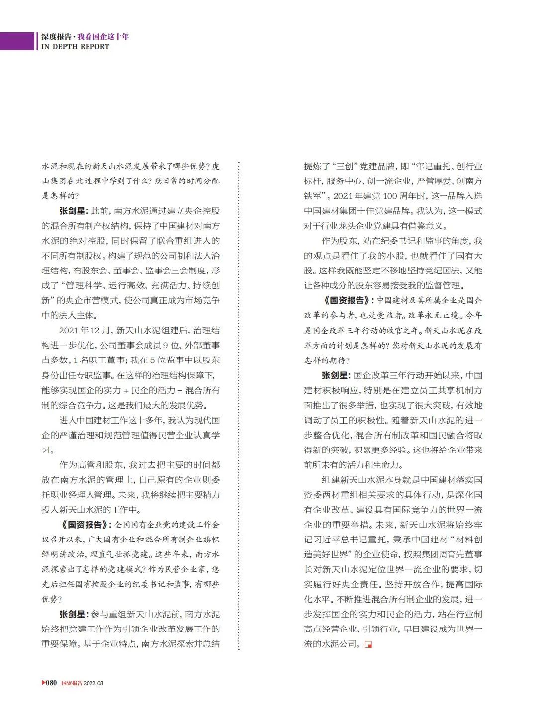改革亲历者访谈 | 《国资报告》专访中国建材新天山水泥张剑星:“国”“民”牵手,皆大欢喜 (db彩票注册入口)