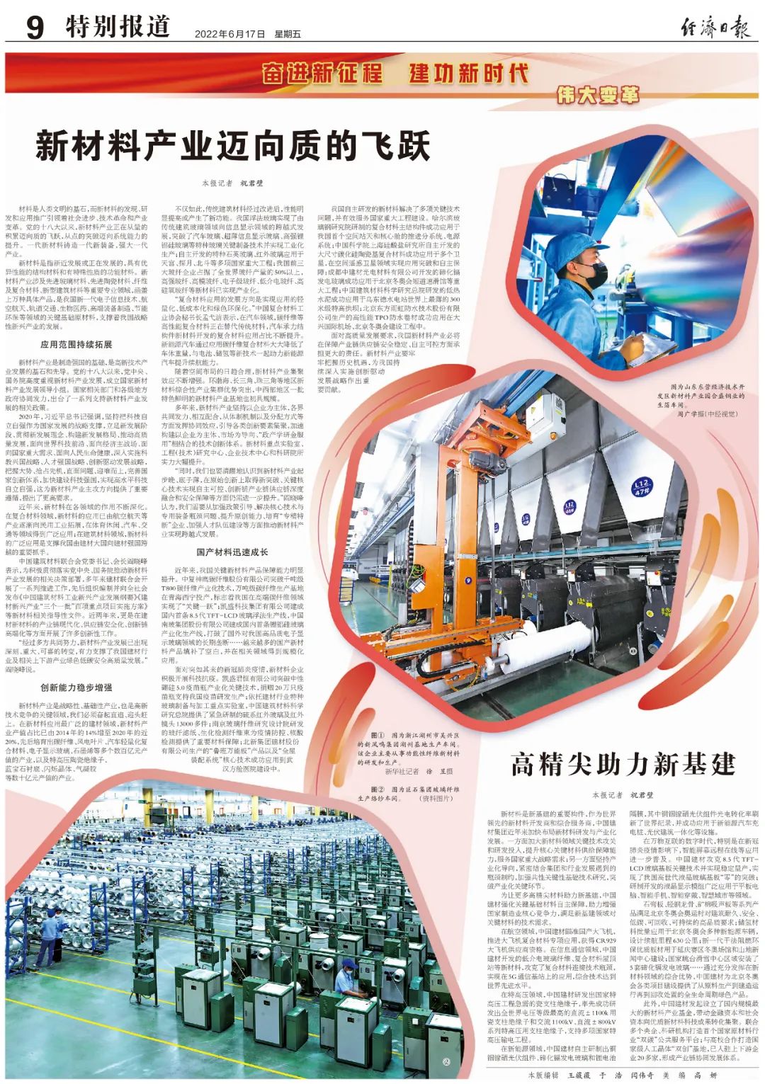 6月17日,为喜迎党的二十大,《经济日报》的“奋进新征程 建功新时代”的伟大变革特别报道刊发了《新材料产业迈向质的飞跃》以及《高精尖助力新基建》的组稿,《新材料产业迈向质的飞跃》文章介绍,党的十八大以来,新材料产业正在从量的积累迈向质的飞跃,从点的突破迈向系统能力的提升,应用范围持续拓展,创新能力稳步增强 db彩票官方,以中国建材为代表的国产材料迅速成长,《高精尖助力新基建》短文专门报道了中国建材所属企业在新材料助力新基建领域取得的诸多成绩。