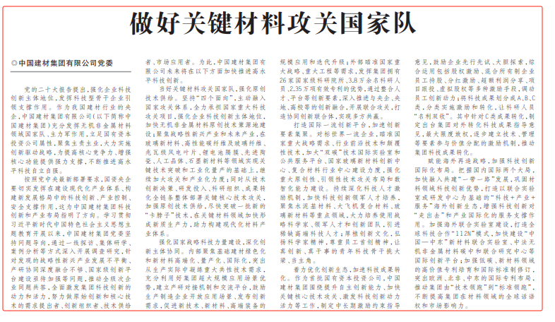 党的二十大报告提出,强化企业db彩票手机版主体地位,发挥科技型骨干企业引领支撑作用,作为我国建材行业的央企,中国建材集团充分发挥无机非金属材料领域国家队,主力军作用,立足国有资本投资公司属性,聚焦主责主业,大力实施创新驱动发展战略,为提高核心竞争力,增强核心功能提供强力支撑,不断推进高水平科技自立自强 db彩票app下载。
