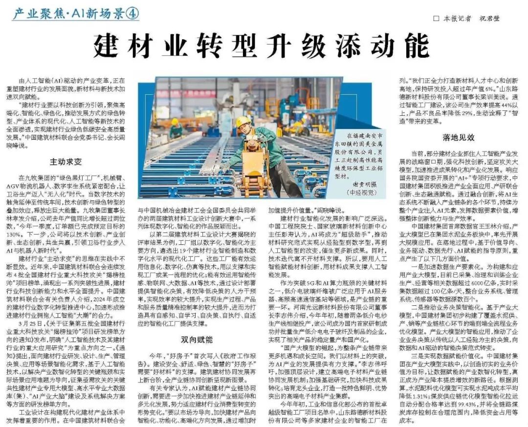 来源:经济日报、集团党委宣传部 发布时间:2025-04-274月25日,《经济日报》刊发《建材业转型升级添动能》一文 db彩票官方,讲述建材行业聚焦高端化,智能化,绿色化,推动发展方式的绿色转型,中国建材积极部署发展生产智能化实践,跟着小料来看看详细内容吧~。