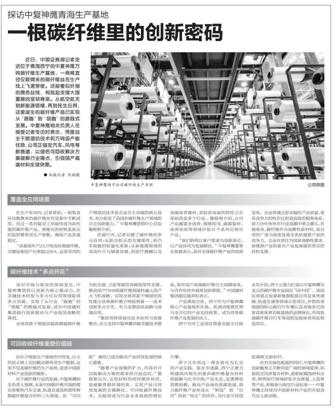 来源:中国证券报 发布时间:2025-07-29近日,《中国证券报》刊发《探访中复神鹰青海生产基地:一根碳纤维里的创新密码》一文 db彩票官方,讲述探访中国建材所属中复神鹰西宁生产基地,探寻高性能碳纤维这一战略性新材料领域的自主创新成果与产业发展脉络,展示其面对全球碳纤维产业的深刻变革,进行积极探索,突破与革新,跟着小料来看看详细内容吧~。