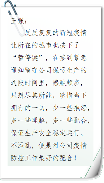 家是幸福的港湾,家是温暖的小窝 db彩票最新版本,然而没有“大家”哪有“小家”,面对疫情,鲁南中联全体员工上下守望相助,共克时艰,此刻他们不再是孩子,母亲,父亲……,在疫情面前他们有一个共同的称号“最美逆行者”,他们毅然踏上了回公司的路,坚守工作岗位,确保封控期间的生产经营平稳运行,他们用实际行动诠释着:责任,担当,作为…….