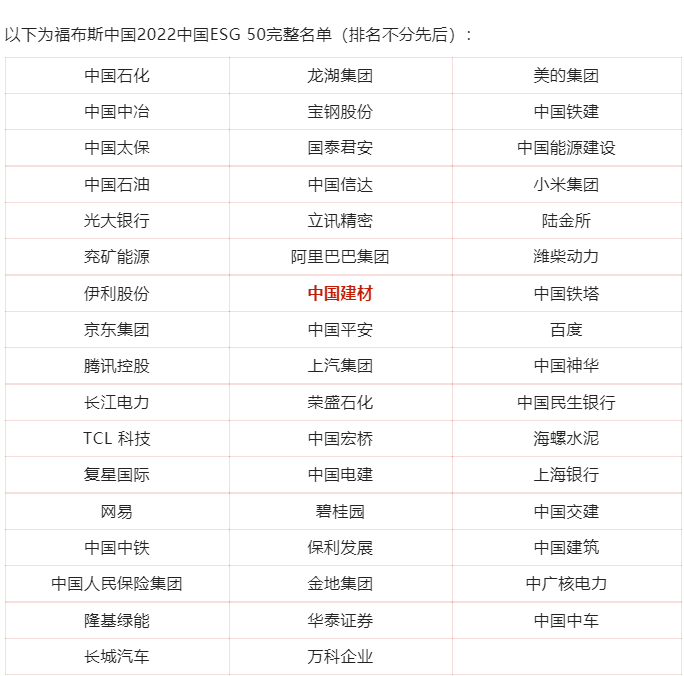 "db彩票安卓版" 喜报 | 中国建材股份入选福布斯2022中国ESG50