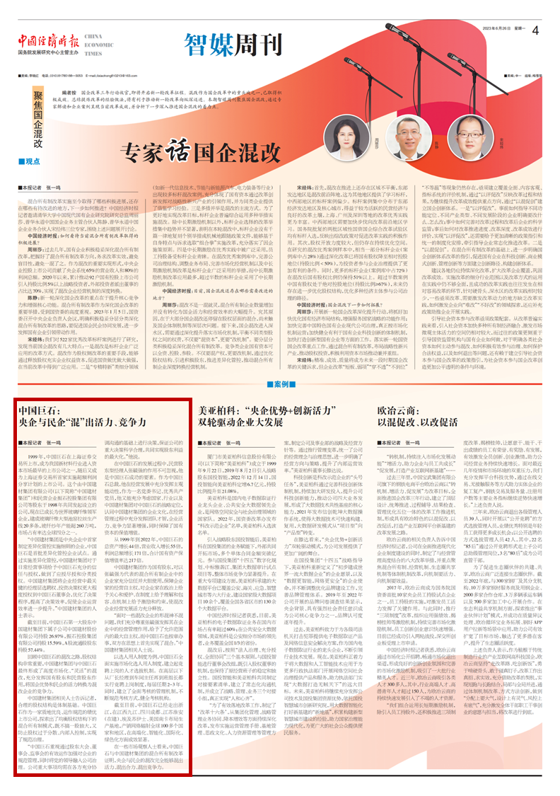 来源:中国经济时报、中国巨石 发布时间:2023-07-036月26日,《中国经济时报》“智媒周刊”聚焦国企混改,通过专家解读和企业案例呈现当前改革成效,并分析下一步深入推进国企混改的着力点,重点报道了中国巨石将国企优势和民企的活力转换为混改企业的竞争力,小料现将内容分享给大家 db彩票官方。