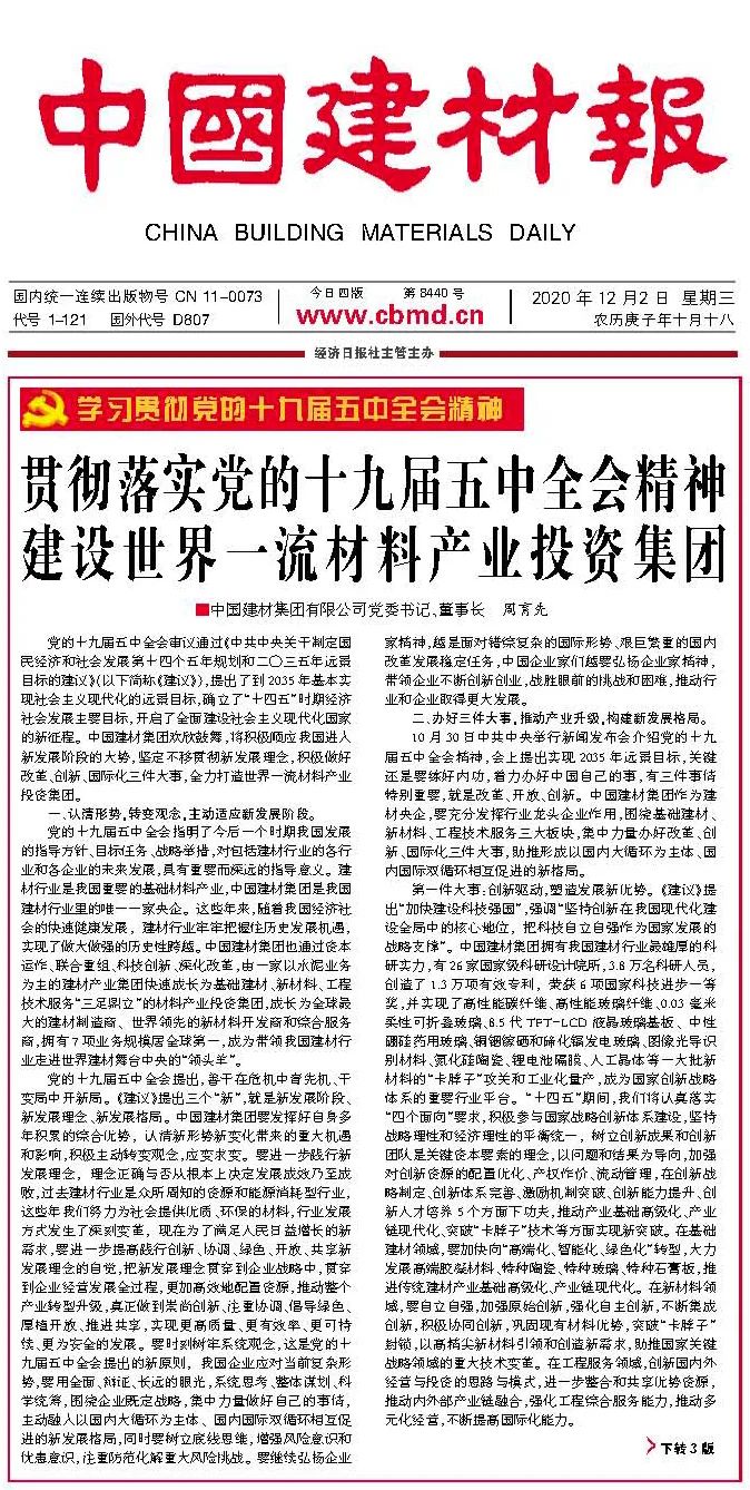 最近一段时间,全社会掀起了深入学习贯彻党的十九届五中全会精神的热潮,中国建材集团党委也迅速学习贯彻落实全会精神,引领企业在新发展阶段取得新发展成就,12月2日,《中国建材报》头版刊发了中国建材集团党委书记 db彩票官方,董事长周育先学习贯彻党的十九届五中全会精神的署名文章。