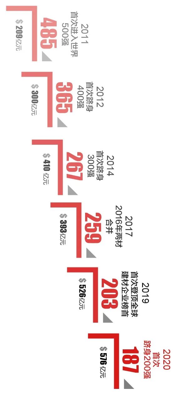 8月2日,2021年《财富》世界500强排行榜发布,中国建材集团以571,15亿美元连续第11年入围该榜单,位列177位,比上一年度前进10位,继续稳坐全球建材行业榜首位置。同时上榜的建材企业还有法国圣戈班集团266位,安徽海螺集团315位,爱尔兰CRH441位。 db彩票官方。