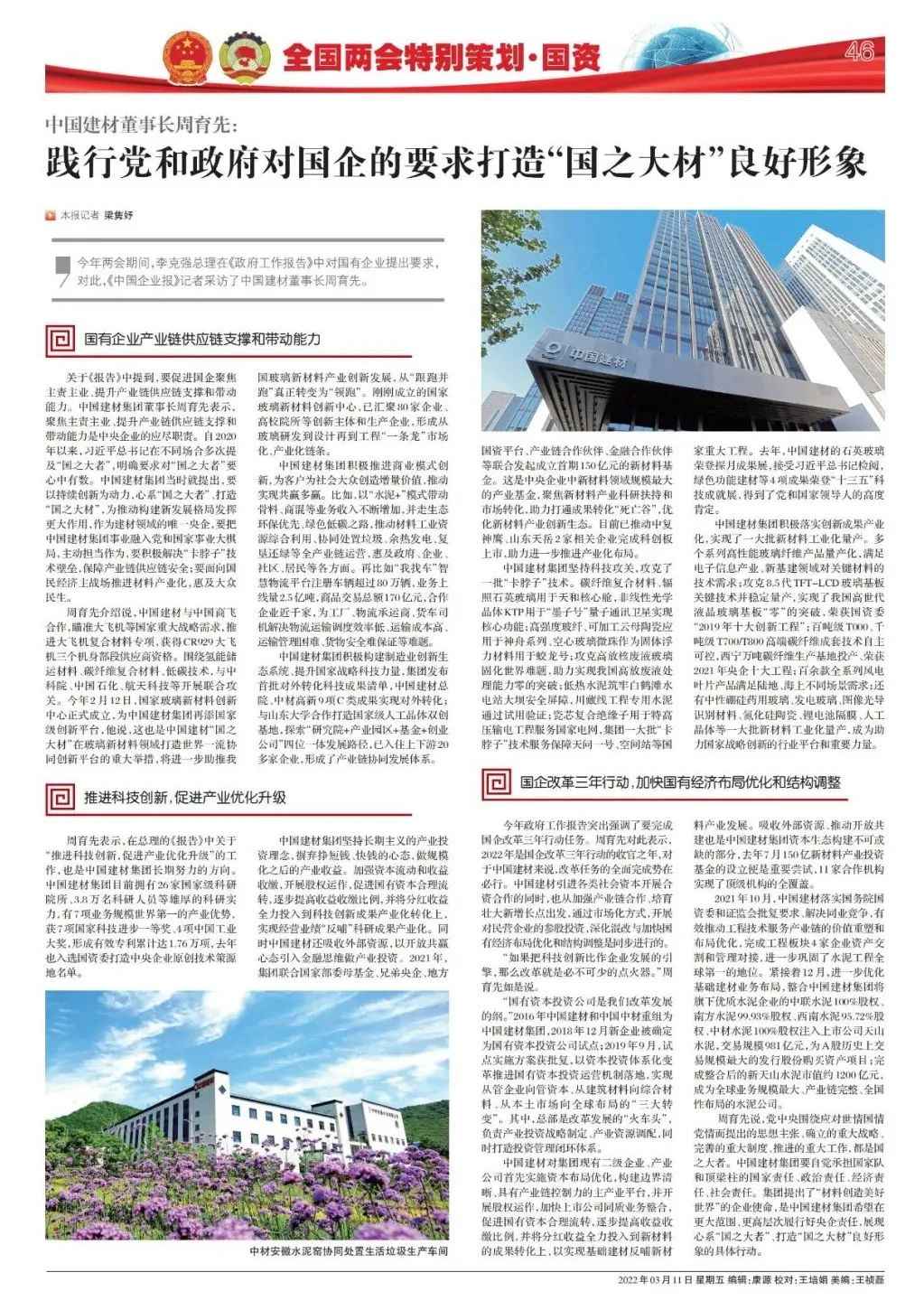 2022年是国企改革三年行动的收官之年,今年全国两会期间,李克强总理在《政府工作报告》中对国有企业提出要求,中国建材集团作为中国建材领域唯一的央企,如何发挥好央企龙头带动作用尤为关键 db彩票官方,对此,《中国企业报》采访了中国建材集团党委书记,董事长周育先。