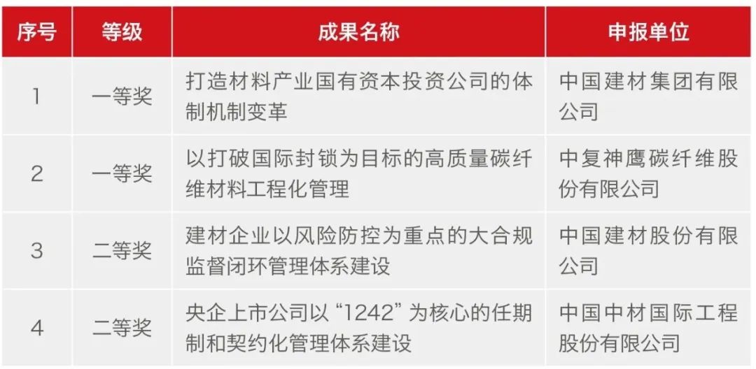 近日,全国企业管理现代化创新成果审定委员会发布《第二十九届全国企业管理现代化创新成果名单》,中国建材集团4项成果入选,一等2项,二等2项 db彩票官方,首次同届荣获2项一等奖,实现了历史性突破。