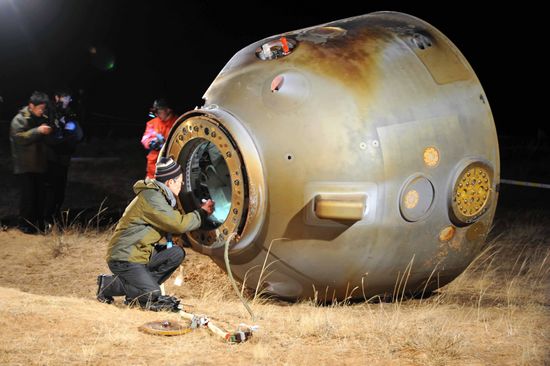 神舟八号返乡之旅需经过制动飞行(告别轨道舱),自由滑行,再入大气层(100公里上空,与推进舱分离)和着陆四个阶段,当返回舱降到距地面10公里时进入最后的着陆阶段,回收着陆系统启动工作,由程序控制器及362C时间控制器(备份)按预设时间程序发出指令,分别控制完成——弹出主伞舱盖,拉出引导伞,减速伞,牵顶伞和主伞,抛防热大底……闪光灯供电,直到着陆前数秒缓冲发动机点火 db彩票app下载,脱主伞等一系列动作,完成回收着陆。