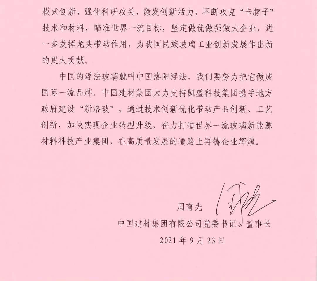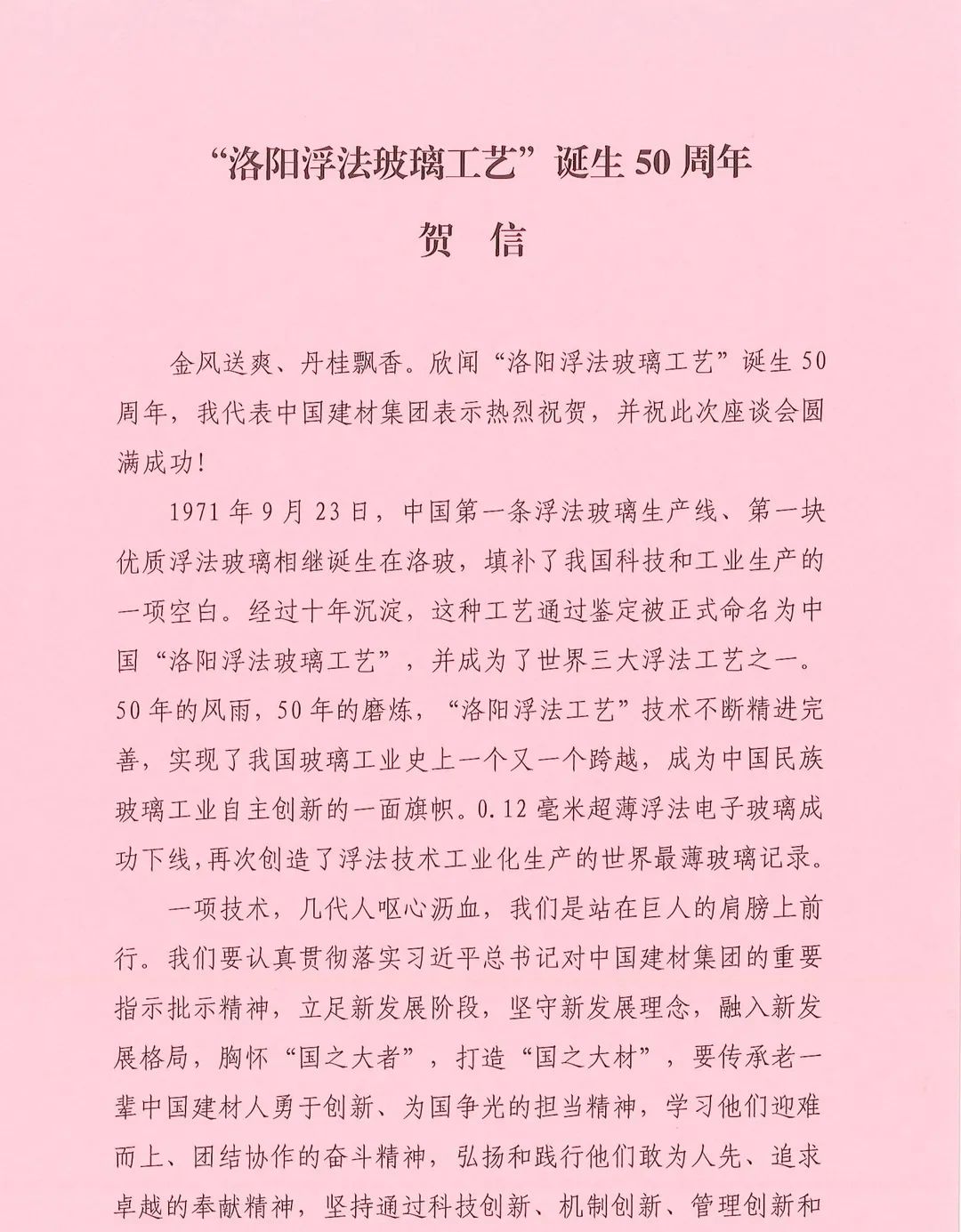 2021年9月23日,洛玻举办了纪念“洛阳浮法玻璃工艺” 诞生50周年座谈会。中国工程院院士、中国建材集团总工程师、凯盛科技集团董事长彭寿发表寄语,向为“洛阳浮法玻璃工艺”发明和创新发展作出贡献的广大科技工作者表示崇高的敬意和热烈的祝贺。同时,表示“洛阳浮法玻璃工艺”是民族玻璃工业发展壮大的核心技术,是传统玻璃向新材料转型的关键技术。自力更生、自主创新、产业报国、勇于奉献是“洛阳浮法玻璃工艺”与生俱来的品质,希望广大玻璃科技工作者心怀“国之大者”,始终保持“关键核心技术要不来、买不来、讨不来”的紧迫感,始终保持“玻璃创造美好世界”的使命感,始终保持建设科技强国、材料强国的责任感,万众一心、同心协力,为国家玻璃工业实现高水平科技自立自强奋勇前进!