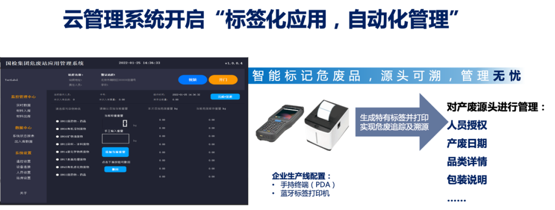 “云管理”是本设施及系统的核心关键点 db彩票ios版,通过云管理系统,用户只需采用设施中的手持终端,蓝牙标签打印机等进行“扫码”,即可生成一个专属标签,完成人员授权,记录产废日期与品类详情等标记,以此对危废产生,收集,贮存,处置,利用等核心环节进行全程信息化跟踪管理,让危废从入库到回收,实现来源可查,去向可追。