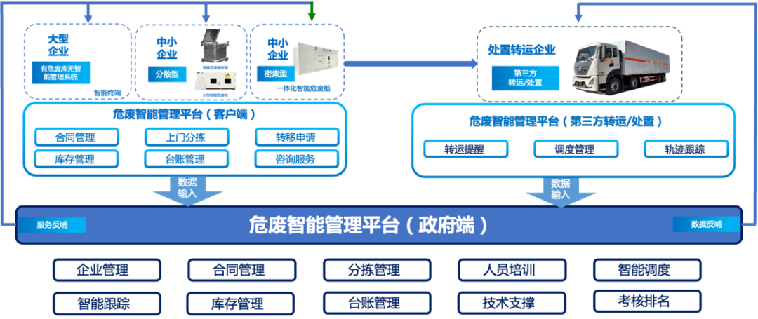 平台利用物联网、大数据和人工智能技术,通过智能终端进行大型园区危险废物的智能化管理,实现了“企业端”“政府端”等多端口的综合联通及调度,不仅帮助园区内的产废企业实现了安全管理、妥善转运及效率的提升,同时也为园区及政府提供了有力的监管手段。