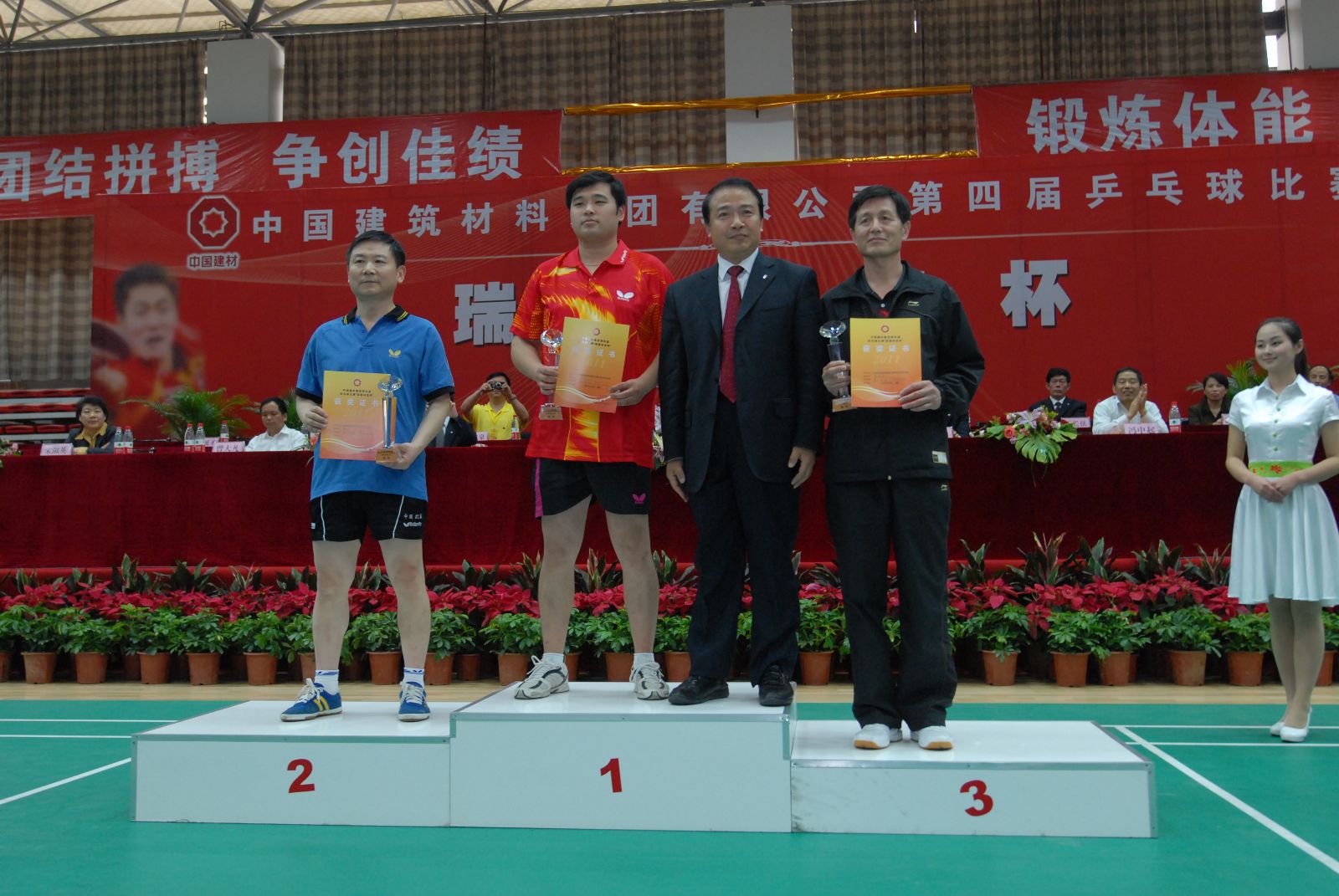 河南中联玻璃有限责任公司贾新智、中国建筑材料科学研究总院王然、中国联合水泥集团有限公司的李勇分别获得男子单打A组前三名;中国洛阳浮法玻璃集团有限责任公司陈涛、中国复合材料集团有限公司王川、刘伟分别获得男子单打B组前三名;女子单打前三名分别由中国复合材料集团有限公司冷晓蕾、河南中联玻璃有限责任公司叶海霞、合肥水泥研究设计院侯依宁获得;管理干部组前三名分别由中国复合材料集团有限公司李韦、中国建材国际工程集团/蚌埠玻璃工业设计研究院顾扬、南方水泥有限公司郝晓波获得。