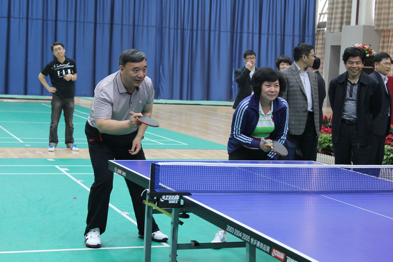 宋志平董事长宣布集团第四届乒乓球比赛开幕,与湘潭市史耀斌市长,姚燕总经理,湘潭市组织部常务副部长徐亚健女士走下主席台,挥动球拍 db彩票注册入口,为本届比赛开球,并进行了表演赛。