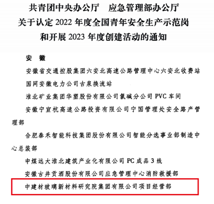 近日,在共青团中央,应急管理部联合组织开展的全国青年安全生产示范岗创建活动中,中建材玻璃新材料研究院集团有限公司项目经营部被认定为2022年度“全国青年安全生产示范岗”,在共青团中央组织开展的全国“两红两优”评选活动中,凯盛光伏材料有限公司团支部获评2022年度“全国五四红旗团支部”,下面,请跟随小料一睹他们的青春风采 db彩票官方。
