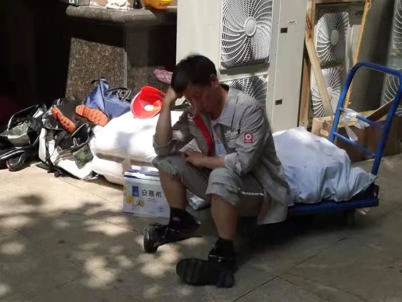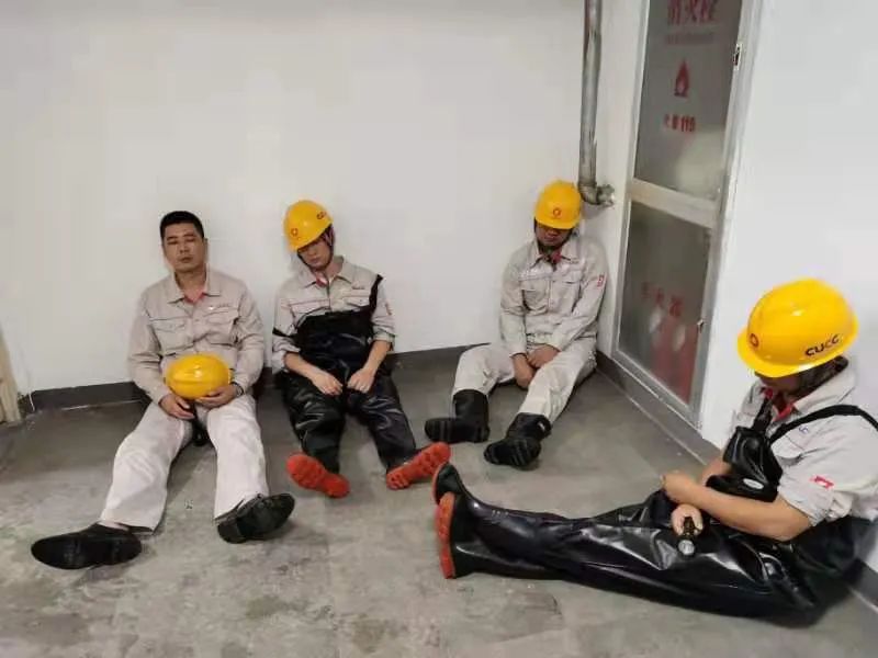 ▲登封中联党员先锋突击队队员席地靠墙休息