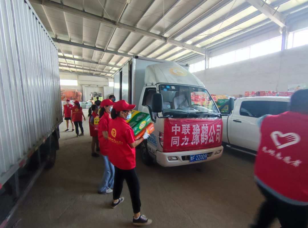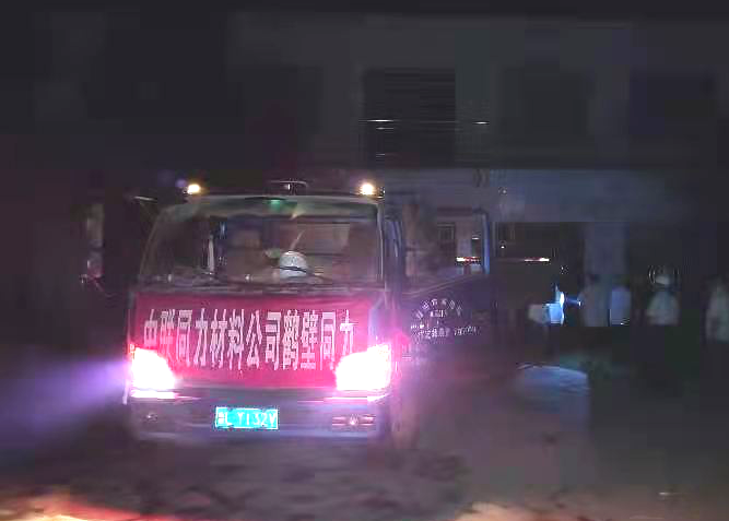 ▲豫鹤同力捐赠防汛物资到达浚县卸车