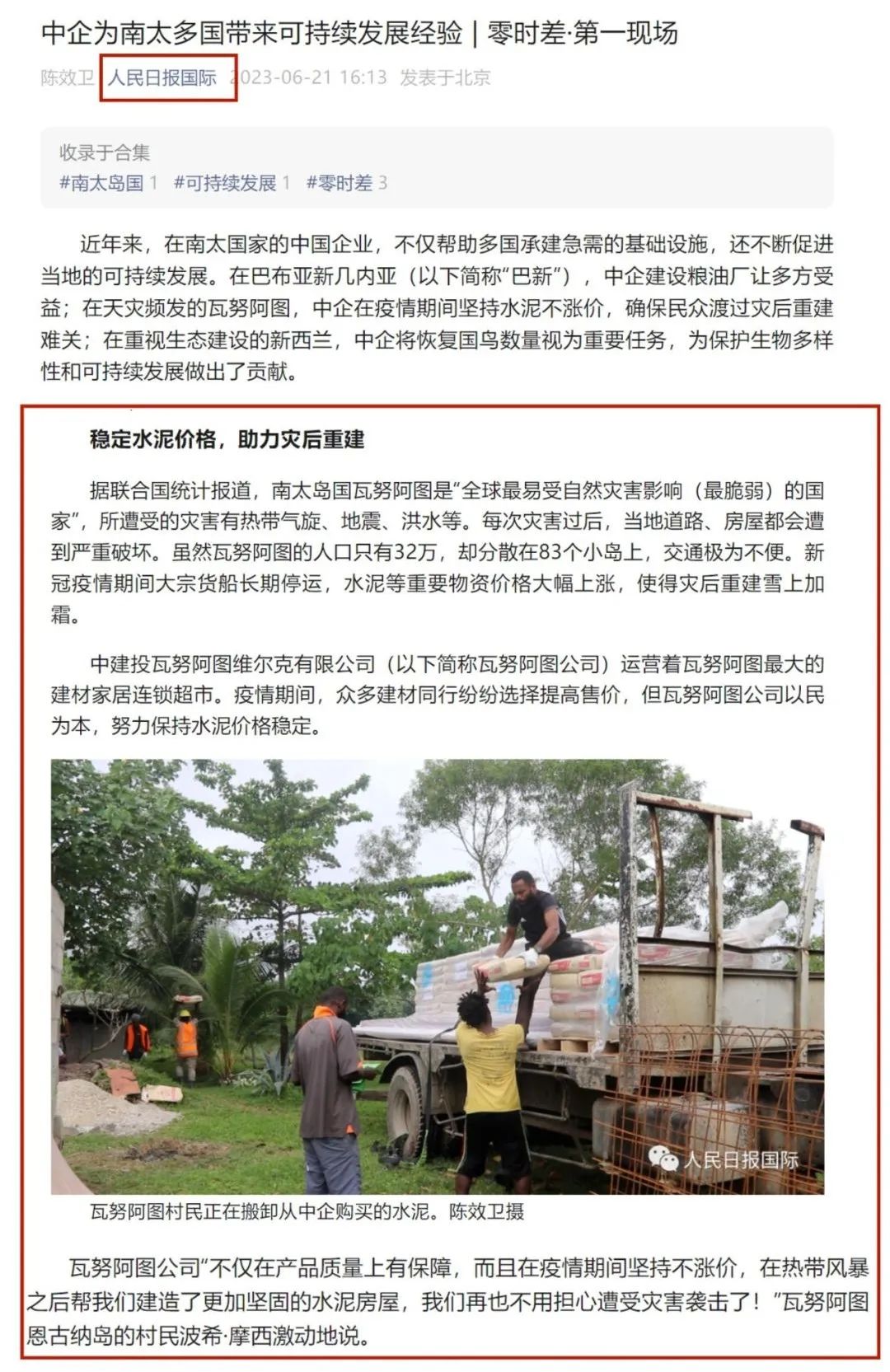 6月21日 db彩票app下载,人民日报国际微信公众号发文《中企为南太多国带来可持续发展经验》,中建投瓦努阿图维尔克有限公司作为瓦努阿图当地最大的建材家居连锁企业,坚持稳定水泥价格,助力当地灾后重建,受到点名报道,现将全文内容分享如下:。