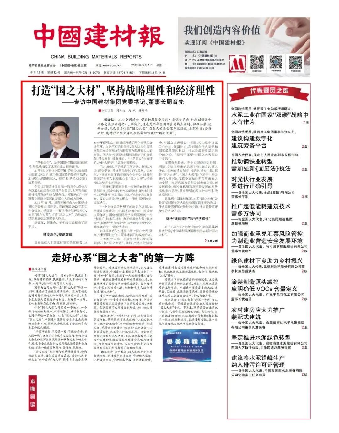 来源:中国建材报 发布时间:2022-03-09编者按 2022年全国两会,哪些话题最受关注,有调查显示,db彩票手机版是十大备受关注话题之一,事实上,这也是历年全国两会的热点话题,初心如磐,使命如炬,代表委员心系“国之大者”,在春天的盛会里参政议政,履职尽责,会场之外,建材行业从业者也在思考如何践行“国之大者”,近日,《中国建材报》专访中国建材集团党委书记,董事长周育先 db彩票官方。