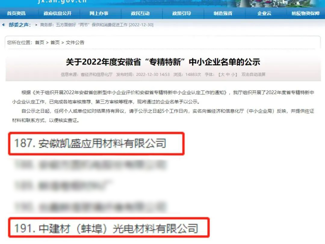 近日,集团所属安徽凯盛应用材料有限公司,中建材(蚌埠)光电材料有限公司获得安徽省“专精特新”中小企业,此次认定是对2家企业在创新能力,研发能力 db彩票官方,技术实力,专业化程度等方面的进一步认可,对企业坚持自主创新,深耕技术的高度肯定。