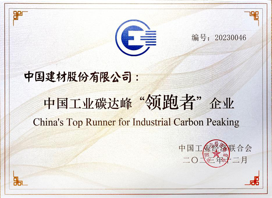 中国建材股份获评中国工业碳达峰“领跑者”企业称号
