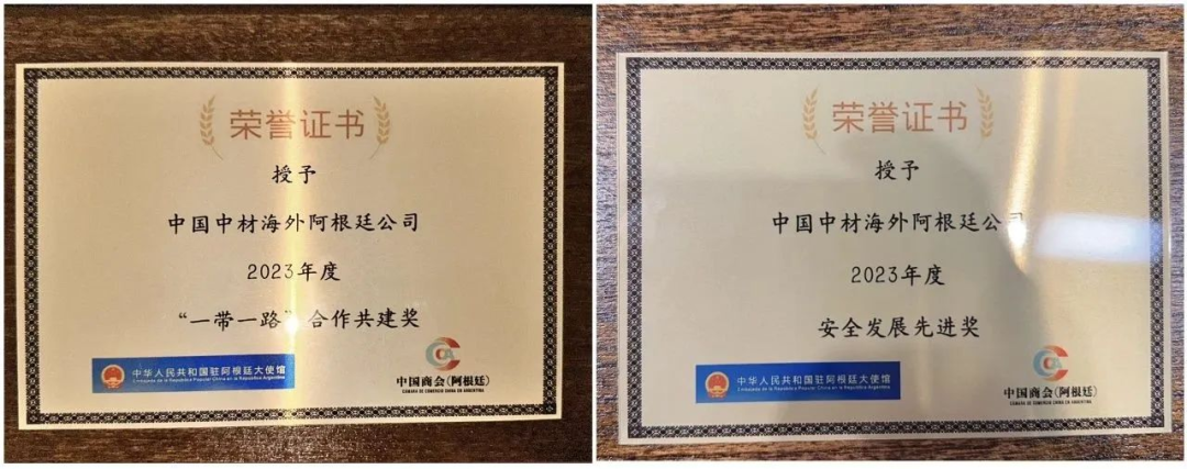 此外 db彩票最新版本,在中国驻阿根廷大使馆的领导下,中国商会组织在阿的各中资企业召开了“2023年中资企业年会”,对杰出中资企业进行了表彰,中材海外阿根廷子公司荣获“2023年度安全发展先进奖”和“2023年度‘一带一路’合作共建奖”。