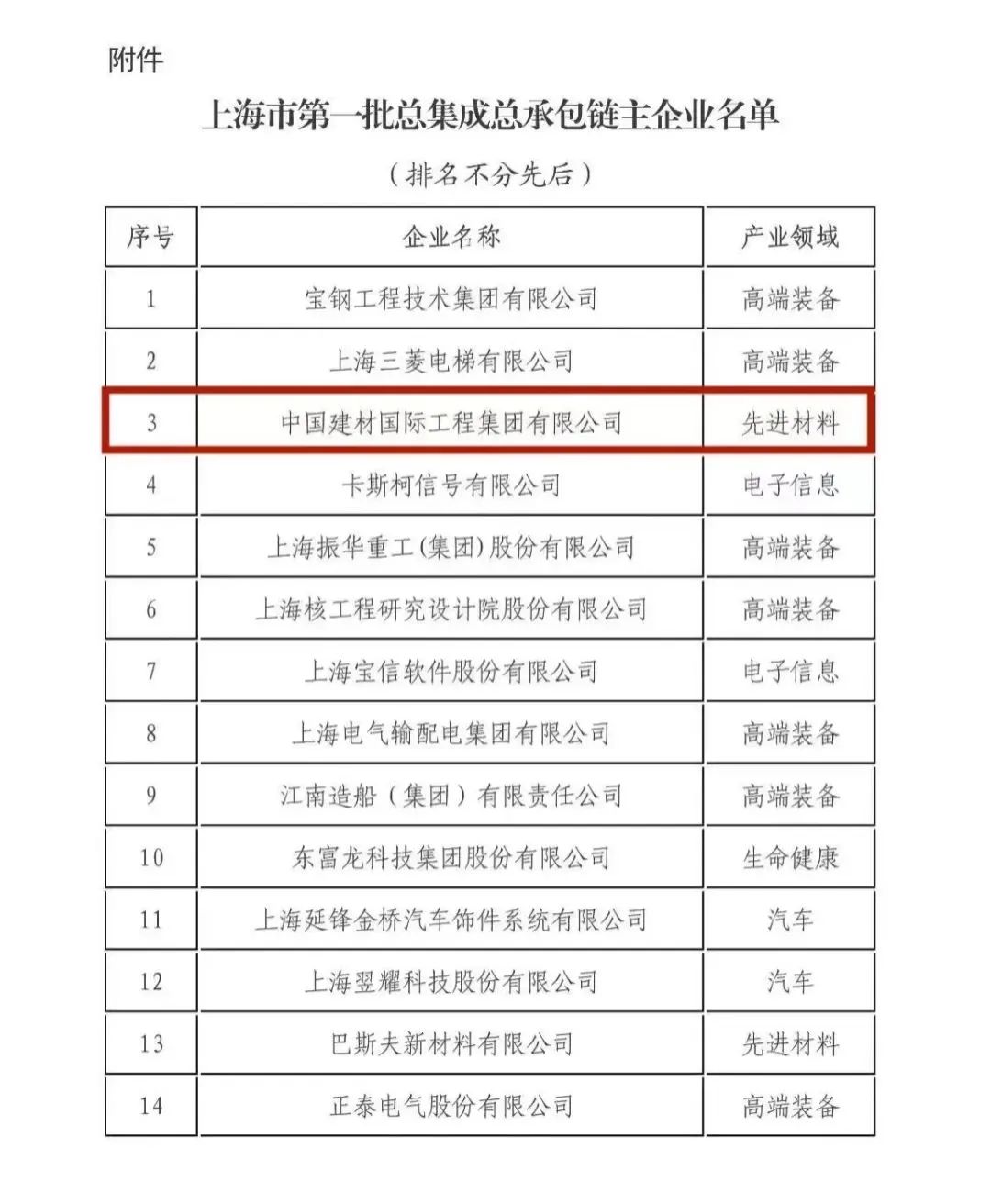 近日,上海市首批总集成总承包链主企业名单正式发布,中国建材国际工程凭借在“先进材料”产业领域总集成总承包的卓越行业影响力,与各行业头部企业一同成功入选首批14家总集成总承包链主企业榜单,此次评选以企业规模实力,产业配套能力 db彩票正版下载,总集成总承包服务能力和产业链带动能力等为考量标准,旨在充分发挥总集成总承包企业在产业集群中的引领作用,进一步赋能先进制造业发展,助力构建现代化产业体系。