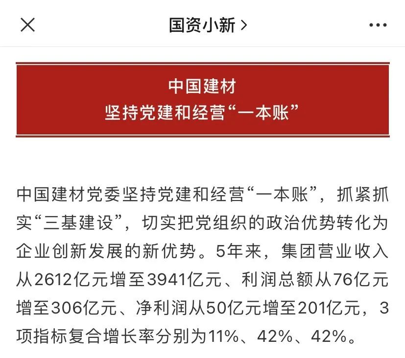 中国建材党委坚持党建和经营“一本账”,抓紧抓实“三基建设”,切实把党组织的政治优势转化为企业创新发展的新优势 db彩票注册入口,5年来,集团营业收入从2612亿元增至3941亿元,利润总额从76亿元增至306亿元,净利润从50亿元增至201亿元,3项指标复合增长率分别为11%,42%,42%。