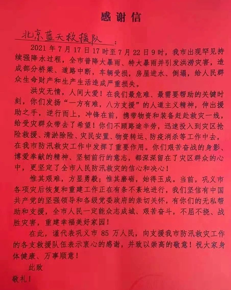 被救的河南巩义村民们还自发为他们送来热饭菜,这意外的温暖让他们热泪盈眶,融化了所有的疲惫和艰难,留下的只有满腔的热血和昂扬的斗志。在完成救援工作,准备默默驱车离开时,季延所在的北京蓝天救援队收到了巩义市防汛抗旱指挥部办公室送来的感谢信,表达了巩义市受灾同胞和群众的无尽感激之情。