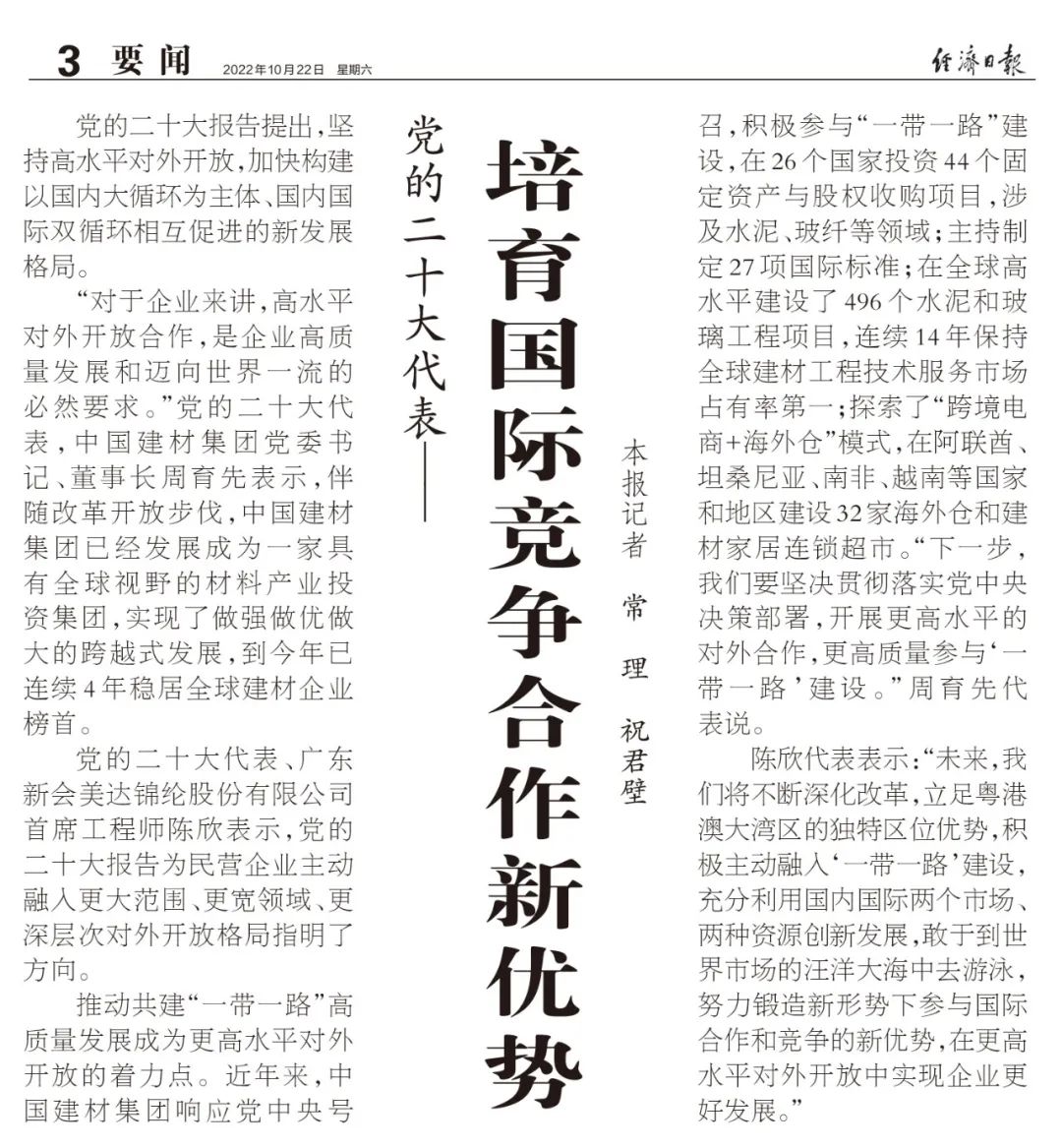 来源:央视新闻、经济日报、中国新闻社、信息日报、齐鲁网、国资小新等媒体 发布时间:2022-10-2410月22日,中国共产党第二十次全国代表大会胜利闭幕,中国建材集团周育先,赵小梅两位代表以高度的政治责任感和历史使命感,履行了党代表的庄严职责 db彩票官方,日前,继人民日报,经济日报,中新社,中国企业家(点击蓝色字体可查看)对他们采访报道后,又有多家媒体进行了采访,小料带您去看看~。