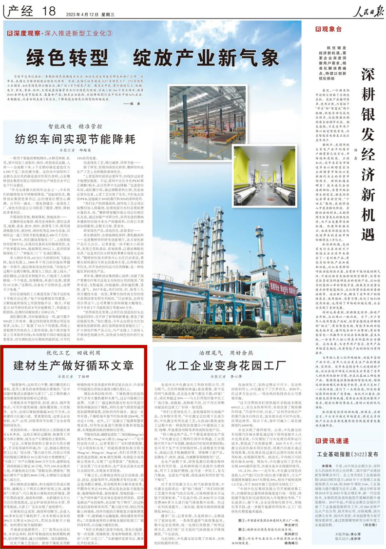 来源:人民日报、北新建材 发布时间:2023-04-134月12日,人民日报刊登文章《绿色转型 绽放产业新气象》,重点报道了北新建材天津工厂坚持绿色制造 db彩票官方,通过实现工业固废循环利用,推行“近零排放”污染物治理技术等加快绿色发展实践,小料现将内容分享给大家。