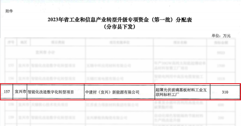 近日,中建材(宜兴)新能源有限公司“超薄光伏玻璃基板材料工业互联网标杆工厂”项目荣获2023年第一批江苏省工业和信息产业转型升级专项资金310万元,转型升级专项资金是省级财政预算安排 db彩票2025版,用于支持全省工业和信息产业转型升级,提升经济发展质量和效益,提高公共服务能力和水平等方面的专项资金。