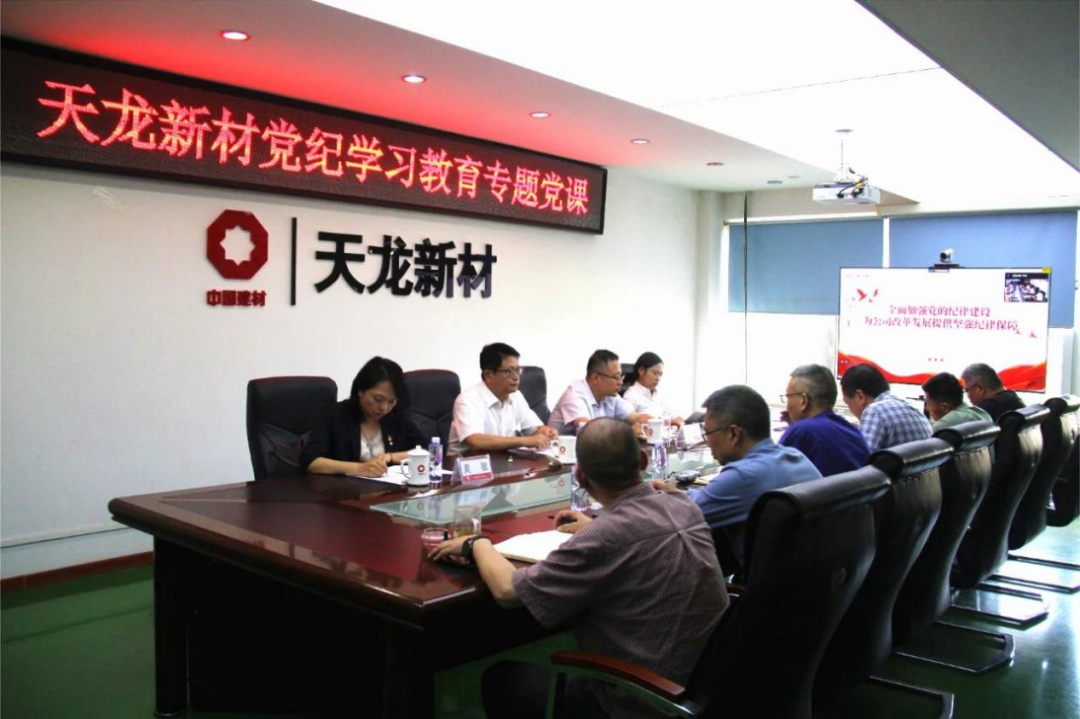 中建材资产管理公司党委书记,总经理冯玮以《全面加强党的纪律建设 为公司改革发展提供坚强纪律保障》为主题,为成员企业天龙新材全体党员干部讲专题党课,在党课中强调,天龙新材作为生产制造型企业,在人事任免,物资采购,招投标等重点领域关键环节应突出纪律意识,要以党纪学习教育为契机,全面准确掌握“六项纪律”的核心要求,不断增强遵守纪律规矩的行动自觉,领导干部要发挥“头雁效应”,在遵规守纪和担当作为上走在前,作表率,真正让纪律严起来,把规矩立起来,带动全公司上下形成建功新时代,争创新业绩的生动局面,天龙新材全体党员,资产公司党员代表 db彩票官网,全体团员参加党课学习。